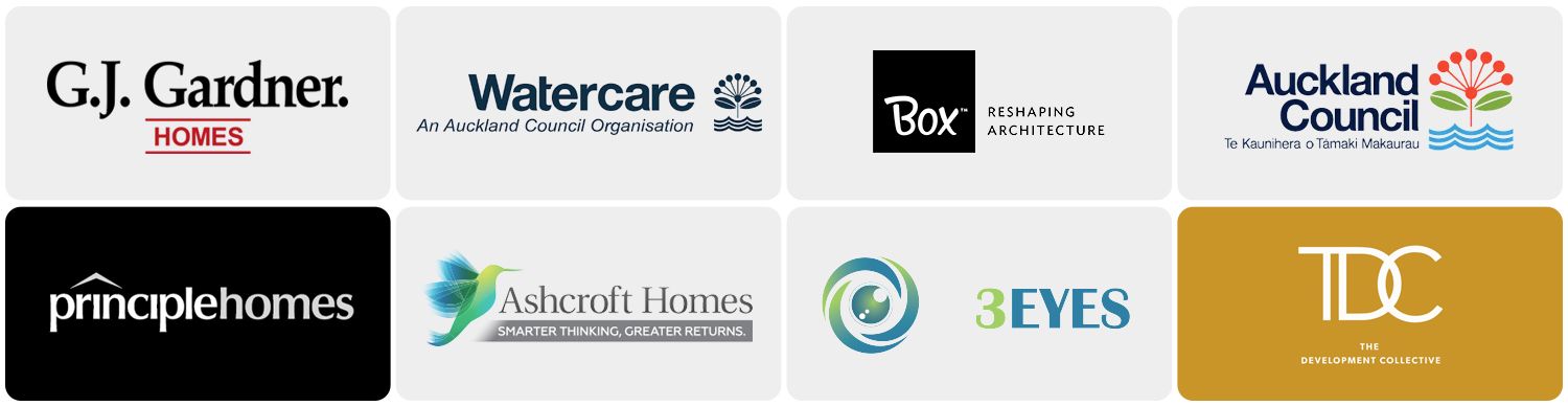 GJ Gardener Homes, Auckland Council, Watercare, Box Reshaping Architecture, Principle Homes, Ashcroft Homes, 3Eyes, TDC